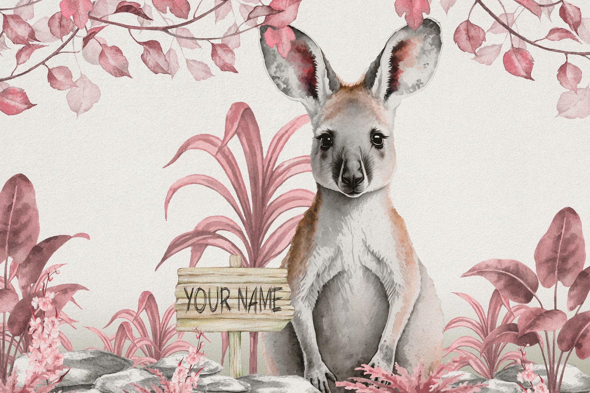 Billedet viser en yndig kænguru på en baggrund af lyserøde planter og hængende blade. Kænguruens bløde gråtoner og jordfarver harmonerer smukt med den lyserøde baldakin og skaber et beroligende, men alligevel levende billede.