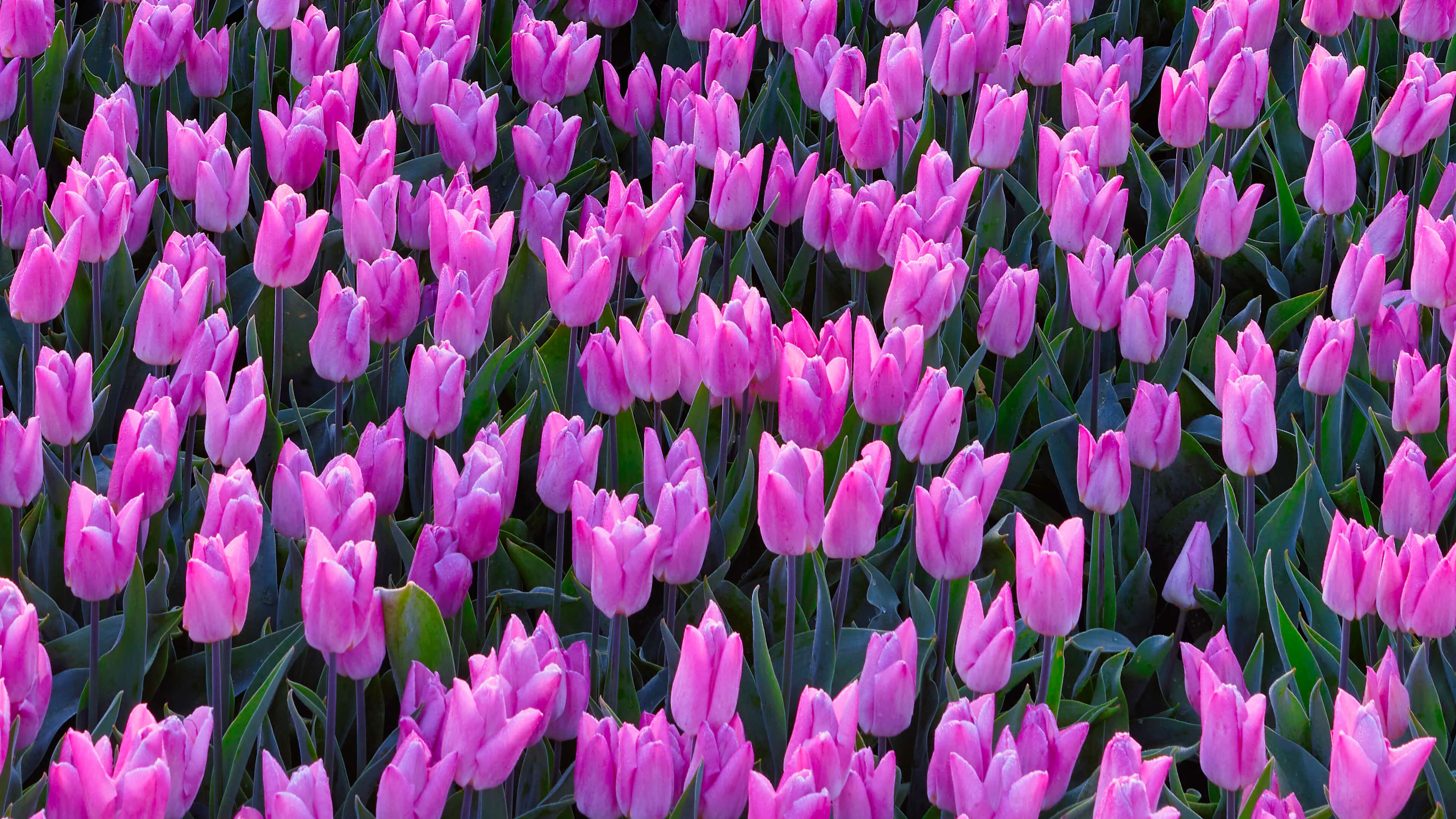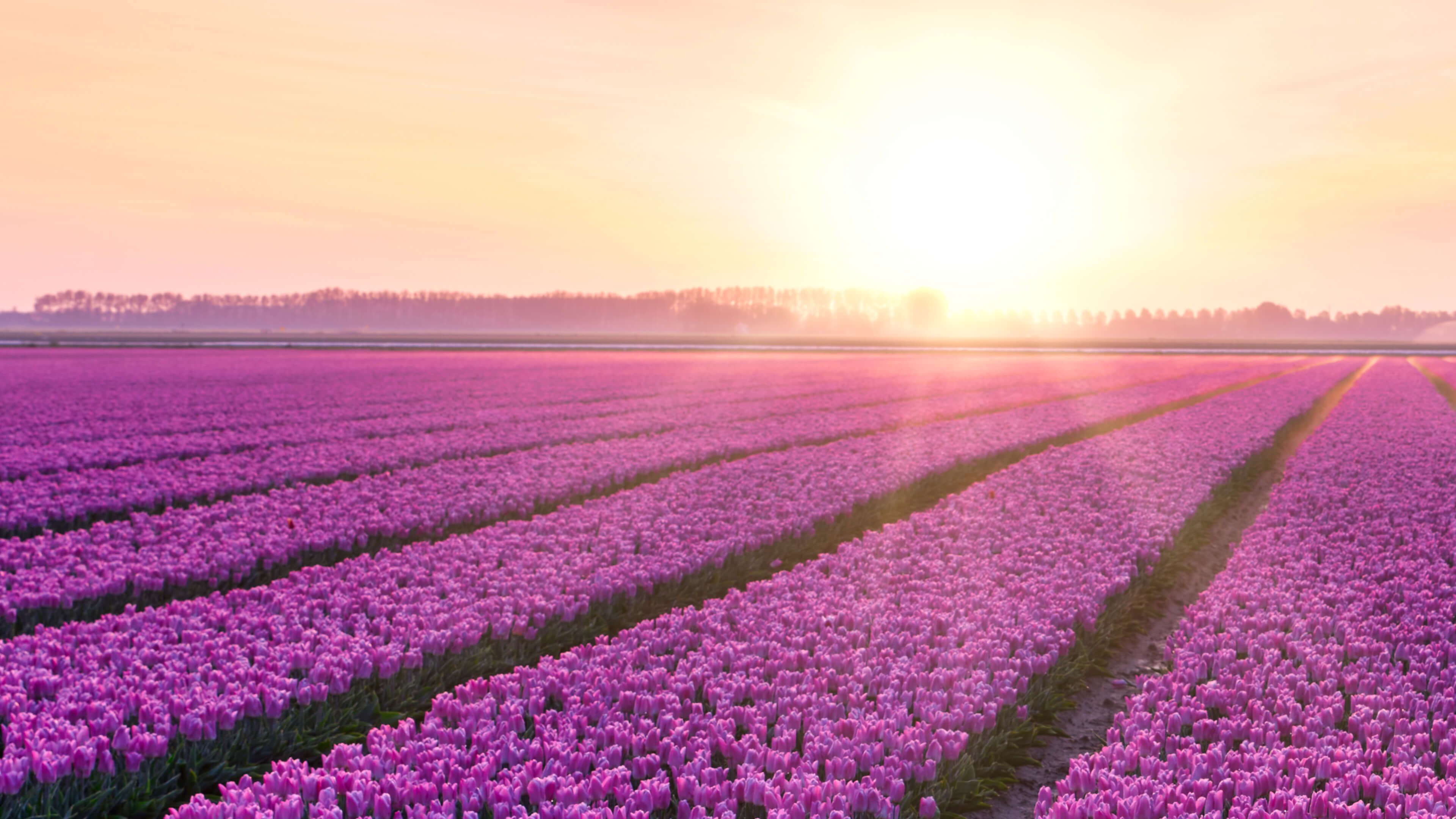 Härligt tulpanfält med rosa tulpaner vid soluppgång