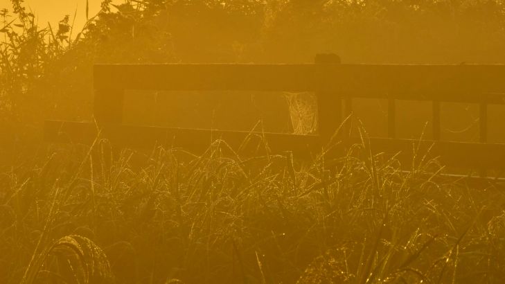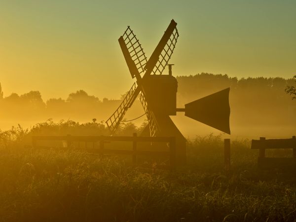 Den härliga ängen maler på soluppgång med detaljerade segel och låg hängoche dimma i bakgrunden