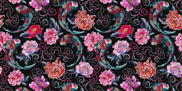 Asiatiska blommor och burkarp på fototapeter. Kombinera den här glada fototapeten i ditt vardagsrum eller sovrum för att skapa ännu mer atmosfär.