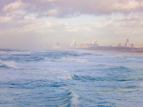 Bat-Yam Beach i Israel. En storm kan ses i fjärran på havet.
