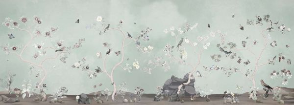 Denna design ger liv till en förtrollande atmosfär, där flora och fauna mästerligt sammanförs. Subtila färger och fina detaljer bildar ett harmoniskt landskap som utstrålar naturens lugn. Blommande blommor, elegant flygande fåglar och härliga fjärilar skapar en livlig scen som utstrålar både dynamik och lugn. De mjuka pastellfärgerna och organiska formerna passar perfekt in i olika inredningsstilar, från en modern skandinavisk miljö till en klassisk eller romantisk atmosfär.