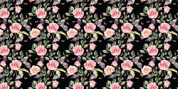 Fototapet med olika blommor och fjärilar som göras av akvarell på en svart bakgrund. En glad akvarell