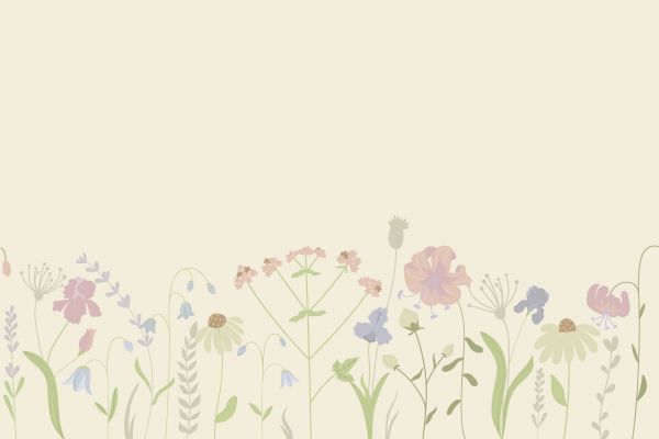 Blomsterfält med olika blommor. Färg: Beige med olika färger som gammelrosa, grönt och lila