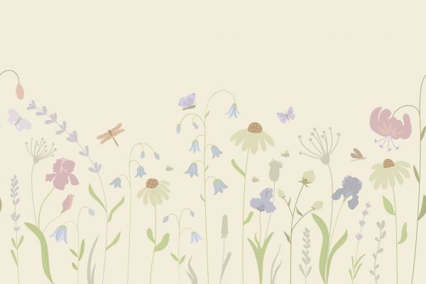 Tapet - Blomsterfält med fjärilar sand, gammalrosa, grön och lila