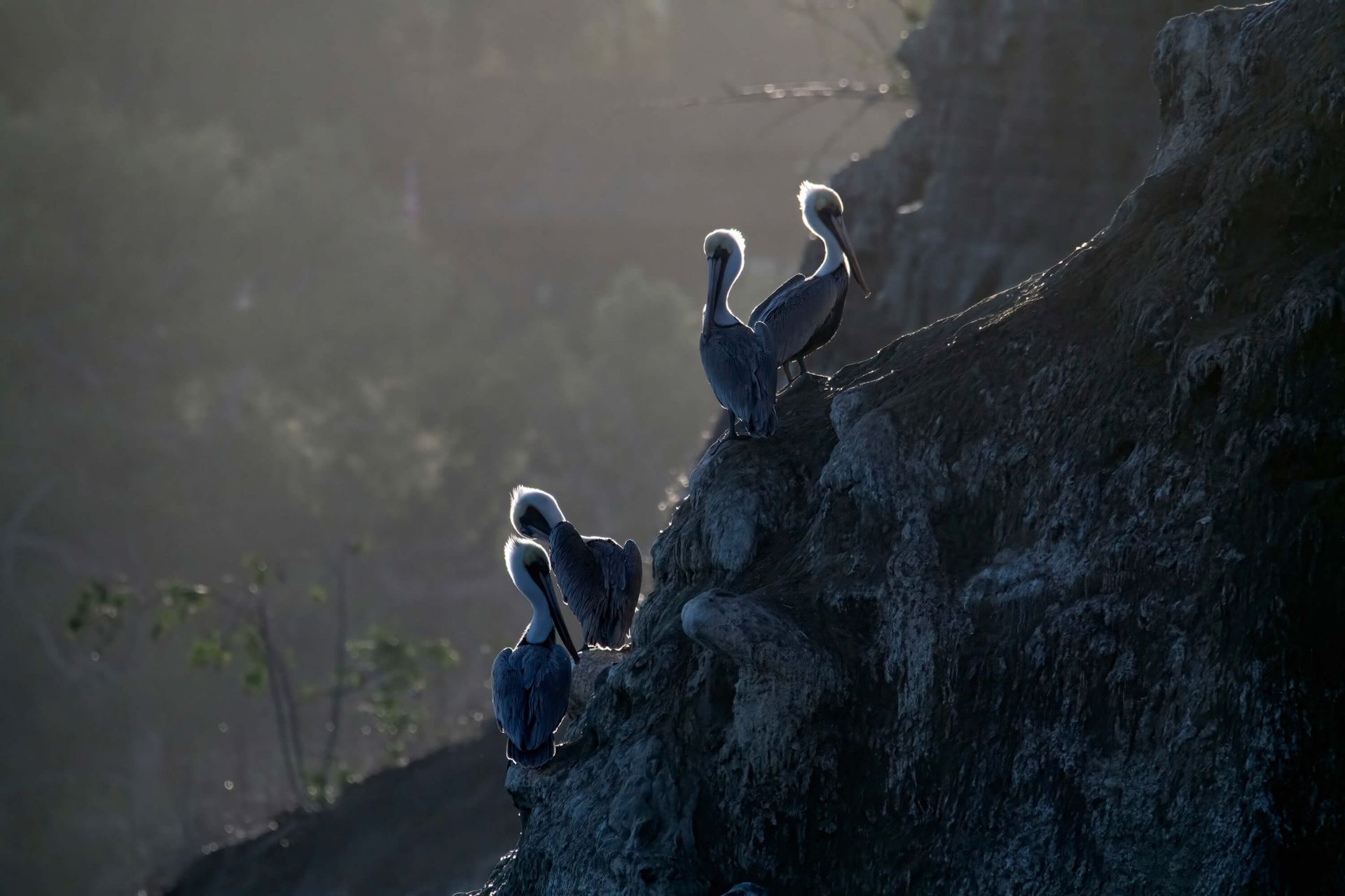 Upplysta bruna pelikaner på klipporna nära La Jolla, San Diego, Kalifornien i soluppgången.