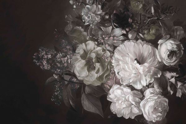 Ditt klassiska blomsterstilleben utstrålar en återhållsam lyx och framhäver skönheten i raffinerade blomkompositioner. De vackra rosorna och pionerna i delikata gröna nyanser och mjuka puderrosa toner kontrasterar elegant mot en mörk, nästan mystisk bakgrund. De detaljerade penseldragen och subtila färgövergångarna skapar en målerisk effekt som påminner om gamla mästare från barock- och romantikperioden. Detta design passar perfekt i en klassisk eller vintageinredning, där det berikar rummet med en känsla av historia och elegans. Kombinerat med sammetsmöbler, antika trädetaljer och mjuka gyllene inslag skapas en varm och överdådig helhet. I en modern inredning kan det istället fungera som ett konstnärligt uttalande, där den mörka bakgrunden och subtila färgtonerna bildar en spännande kontrast med strikta linjer och minimalistiska element. De djupa och mjuka tonerna gör denna design ytterst lämplig för intima utrymmen som en elegant matsal, ett chic sovrum eller en stämningsfull lounge. I ett boutiquehotell eller exklusiv butik kan det ge en unik och lyxig känsla, medan det i ett vardagsrum skapar en raffinerad och konstnärlig atmosfär. För att förstärka den romantiska och vintage känslan kan tillbehör i antik guld, mässing eller mörkt trä läggas till. Varm belysning, som stearinljus eller dämpade vägglampor, kommer att få de rika färgerna att leva ännu mer och accentuera den dramatiska bakgrunden. Denna design är en tidlös hyllning till blommornas skönhet och för med sig en unik kombination av nostalgi, lyx och raffinemang i varje rum.
