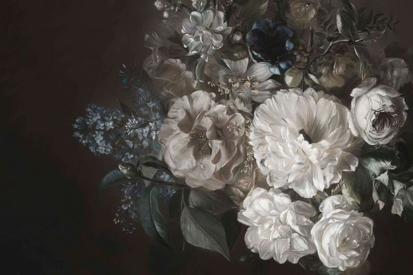 Ett lyxigt blomsterstilleben med frodiga rosor, pioner och delikata vildblommor i mjuka krämfärger och subtilt blått. Den mörka bakgrunden ger en dramatisk och elegant kontrast, vilket gör helheten tidlös och raffinerad. En stilfull komposition som hämtar storheten från klassisk konst in i hemmet.