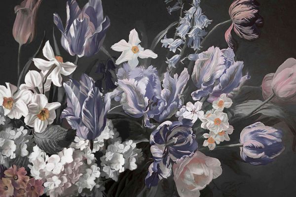 Ett elegant och klassiskt blomsterstilleben med storslagna tulpaner, påskliljor och blomknoppar i rika blå-, lila- och crèmefärger. Den mörka bakgrunden förstärker det dramatiska kontrastet och ger designen en tidlös och raffinerad känsla. Perfekt för en lyxig och konstnärlig inredning.