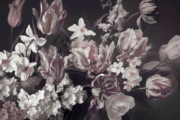 Ett elegant blomsterstilleben med graciösa tulpaner, påskliljor och blomknoppar i mjuka rosa- och jordtoner. Den mörka bakgrunden skapar en dramatisk kontrast, medan de raffinerade detaljerna och subtila penseldragen ger designen en klassisk och tidlös känsla. Perfekt för en lyxig och romantisk inredning.