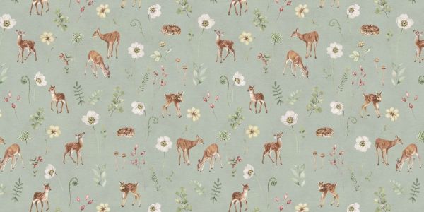 Ett delikat skogsmönster med eleganta hjortar och subtila blommor i mjuka pastellfärger. Denna lekfulla design utstrålar en kärleksfull och naturlig atmosfär, perfekt för att lägga till en mjuk och charmig accent i varje rum.