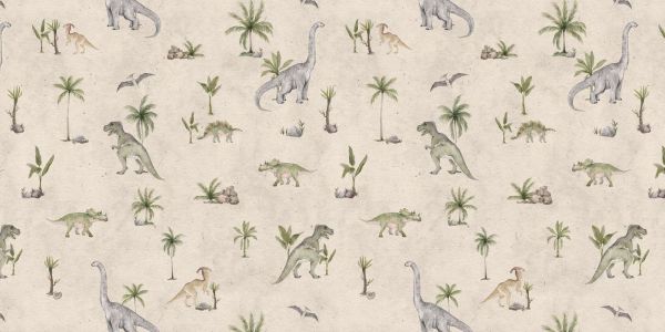 Ett äventyrligt mönster fullt av dinosaurier, som T-Rex och stegosaurus, mellan förhistoriska växter och landskap. Den ljusa bakgrunden och mjuka illustrationerna ger en lekfull, nostalgisk atmosfär som är perfekt för att lägga till en fantasifull accent i varje rum.