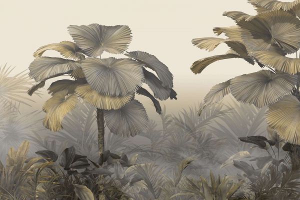 En tät samling av tropiska växter och träd framträder ur dimman, vilket skapar en känsla av upptäckt och förundran. De subtila nyanserna av grönt och brunt föreslår dagens tidiga timmar, när världen vaknar under en mjuk dimmig filt.