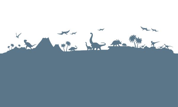 Gråblå bakgrund som fortsätter halvvägs genom trycket och blir ett silhuettlandskap med dinosaurier.