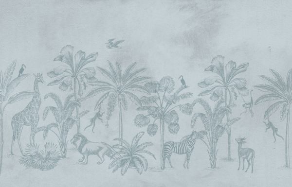 En riktig djungel i blått. Djungeln består av lejon, giraffer, apor, hjortar och mycket mer. Hip och trendig tapet.