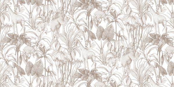 Djur bland palmer i taupe. I det här mönstret hittar du kaniner, pantrar, elefanter och giraffer med fjärilsvingar.