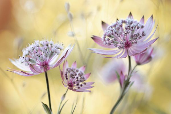 Astrantia Major på foto tapet. Et nærbillede af smukke lyserøde blomster, som du kan kombinere med dette tapet for at skabe et endnu mere stemningsfuldt indendørs miljø.