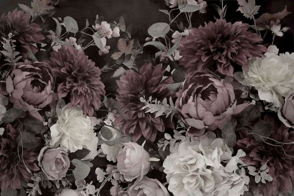 Dit luksuriøse design kombinerer den tidløse skønhed af pæoner og roser med en dyb, varm farvepalet. De bordeauxrøde og blommefarvede blomster skaber et rigt og dramatisk udtryk, mens de elfenbensfarvede roser og grålige blade giver en blød kontrast. Den mørke baggrund tilføjer et strejf af mystik, hvilket får det hele til at minde om klassiske stilleben fra malerkunsten.