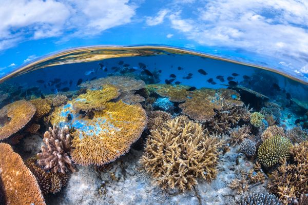 Et foto af et koralrev, hvor man kan se både over og under vandet. Dette giver billedet en rund effekt.