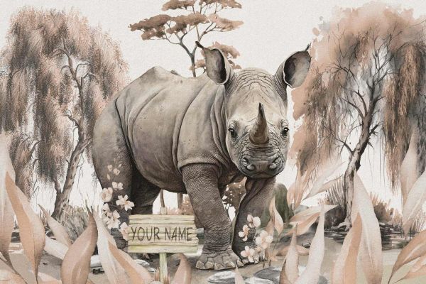 En næsehornsunge på den taupefarvede savanne. Kan nu også personaliseres med dit barns navn!