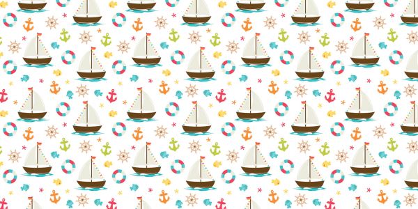 Mønster med både, bøjer og ankre på en hvid tapet