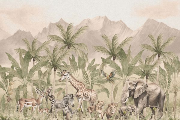 Dette betagende design tager dig med på en rejse gennem et frodigt bjerglandskab, hvor farverige flora og fauna mødes i harmoni. Beundre eksotiske safaridyr, såsom staselige giraffer, elegante løver og nysgerrige elefanter, der bevæger sig frit i deres naturlige levested. Bliv inspireret af den naturlige pragt af en safari, direkte i dit eget opholdsrum.