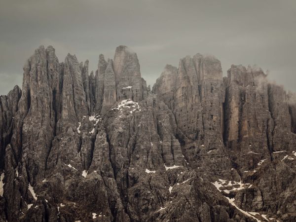 Skyede bjergtoppe i Dolomitterne i Norditalien. Der ligger lidt sne på bjergene.