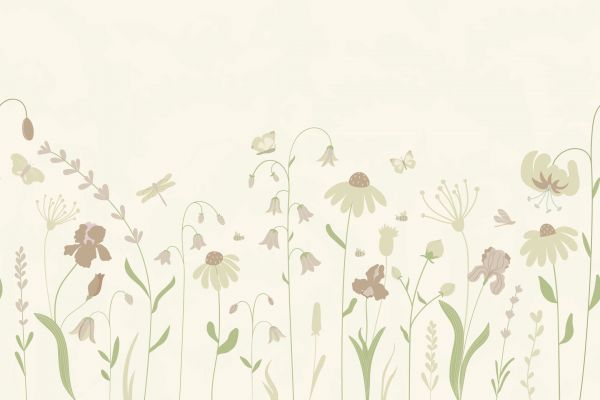 Høj blomstermark med forskellige blomster og forskellige insekter som sommerfugle og bier. Farve: Beige med gammelrosa