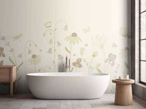 Høj blomstermark med forskellige blomster og insekter, såsom sommerfugle og bier, i forskellige nuancer af beige og gammelrosa Farve: Beige og gammelrosa