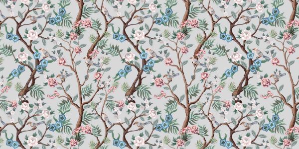 Dette design har en levende samling af grene, rigt dækket med flerfarvede blomster og yndefulde fugle. Mønsteret emmer af spirende forår med en palet, der udstråler ro og naturlig skønhed.