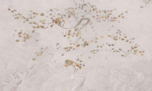 Denne minimalistiske og elegante illustration udstråler ro og raffinement. Svævende grene med yndefulde, næsten gennemsigtige blade breder sig over en blød, beige baggrund. De delikate penselstræk og brugen af subtile farvegradienter i varme brune nuancer, guldgul og blød grøn giver designet en næsten meditativ udstråling. Små fugle flakser stille mellem bladene, som om de er en del af et stilfærdigt japansk billede eller et gammelt vægmaleri. Farvepaletten består af varme neutrale toner: creme, sand, lys taupe og bløde amberaccenter. Disse afdæmpede farver skaber en fredfyldt atmosfære og gør dette design perfekt til minimalistiske, østlige eller moderne interiører. Kombiner det med naturlige materialer som lyst træ, bambus, linned og keramik for at skabe et harmonisk rum, hvor stilhed og balance er i centrum. Denne illustration er særdeles velegnet til rum, der kræver ro og fokus, såsom et soveværelse, meditationsrum, kontor eller entre. Billedet udstråler afdæmpet skønhed og virker visuelt beroligende uden at være kedeligt. Kompositionen med åben plads og asymmetri skaber en følelse af åndedrag og bevægelse, mens det organiske linjespil vækker forbindelse til naturen. For elskere af østlig æstetik, Zen-interiører eller fredfyldt kunst er dette design et tidløst supplement til ethvert rum. Den subtile lagdeling og tekstur i baggrunden giver helheden ekstra dybde og gør billedet mere end dekorativt – det bliver næsten en stemningsbærer.