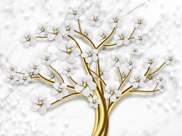 Et gyldent træ med hvide blomster på en marmorbaggrund.