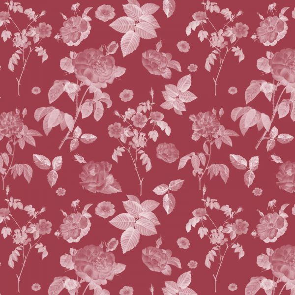 Et raffineret botanisk mønster med delikate roser og blade i bløde nuancer mod en dyb rød baggrund. Designet udstråler klassisk elegance og tidløs skønhed.