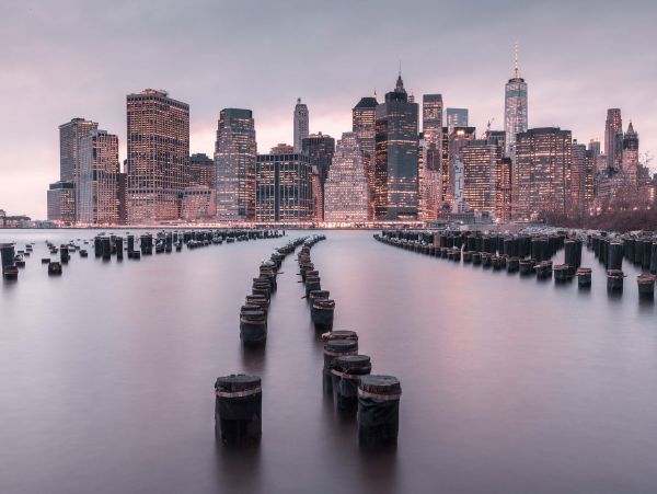 Bølgebrydere på Manhattan på fototapet. Dette billede blev taget i begyndelsen af __aftenen, lysene er allerede tydeligt synlige.