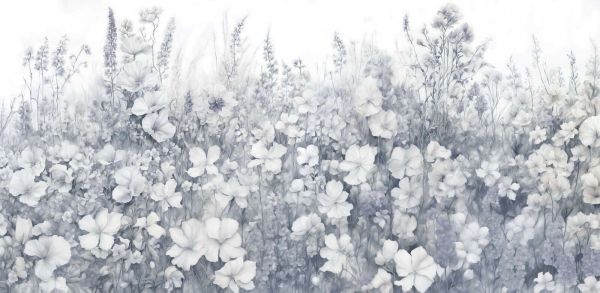 Dit design viser en stille blomstereng i et palet af subtile gråtoner, hvor lilla og hvide blomsterknopper finder deres plads i en blød, tåget baggrund. De raffinerede penselstræk skaber et roligt og drømmende udtryk, hvilket gør designet let at tilpasse forskellige indretningsstile.
