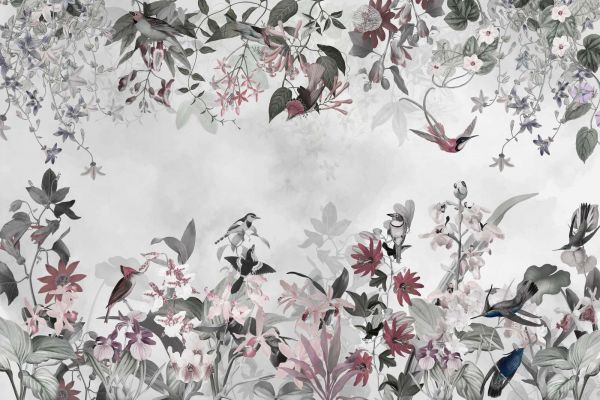 Dette smukke design kombinerer naturlige elementer såsom blomstrende blomster, yndefulde fugle og en blød baggrund for at skabe en rolig og fortryllende atmosfære. En harmonisk helhed skabes med en palet af pastelfarver og naturlige nuancer, såsom blød grøn, lys pink og subtile jordfarver. Detaljerne i flagrende fugle og botaniske motiver tilføjer en dynamisk, men underspillet følelse. Ideel til en stue eller soveværelse, hvor der ønskes ro og elegance, eller til at give et unikt udtryk til et kontorlokale. Kombiner dette design med neutrale møbler og tilbehør, såsom træaccenter eller linnedstoffer, for at fremhæve de naturlige elementer. Denne tidløse sammensætning er velegnet til både moderne og klassiske interiører.