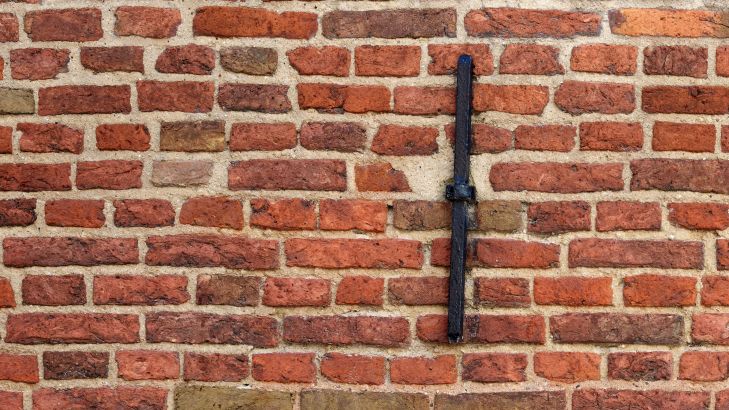 Historisk rød bymur med stålsorte vægankre i forskellige positioner