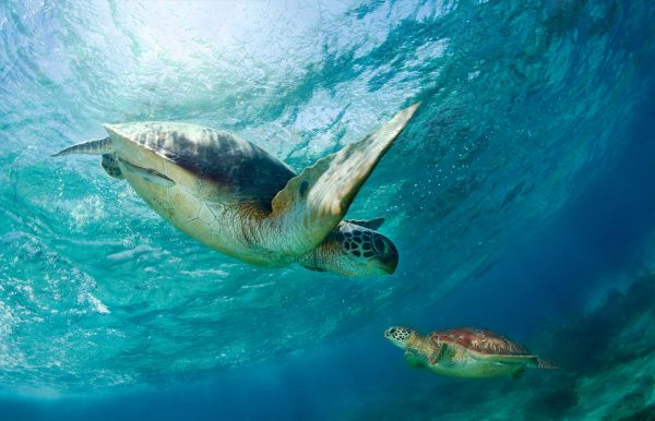To skildpadder i havet med høje bølger. Dette fototapet bringer undervandsverdenen ind i dit hjem.