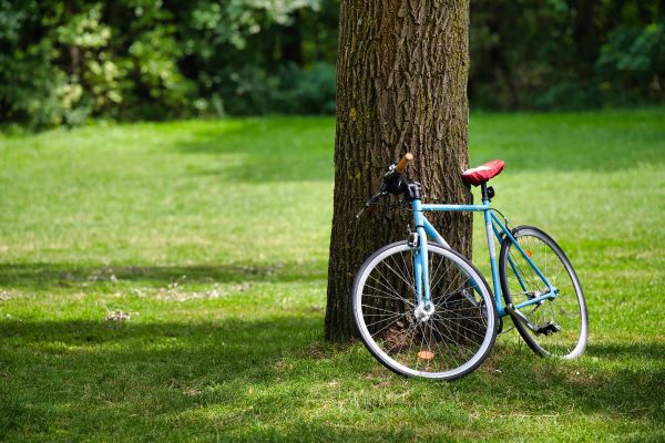En cykel parkeret mod et træ i en park. Anvend dette på en væg i soveværelset.