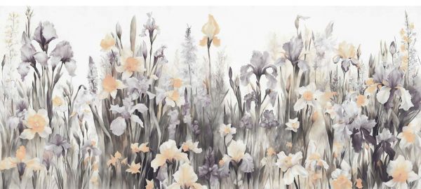 En blød blomstereng fyldt med iris og påskeliljer i cremede beige akvareltoner. De subtile, naturlige farver skaber en hyggelig og indbydende atmosfære, der kommer til sin ret overalt.