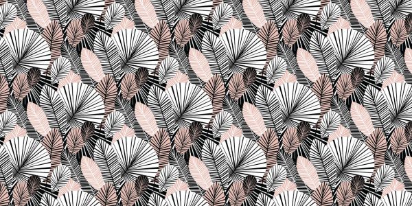 Mønster af forskellige blade i farverne sort, hvid og blød lyserød.