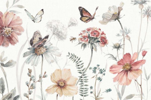 En luftig komposition af markblomster i bløde pastelfarver, hvor sommerfugle og en bi yndefuldt svæver mellem stilkene. Akvareleffekten giver det hele en drømmende, næsten poetisk atmosfære.