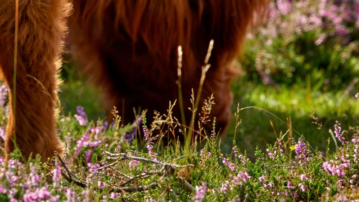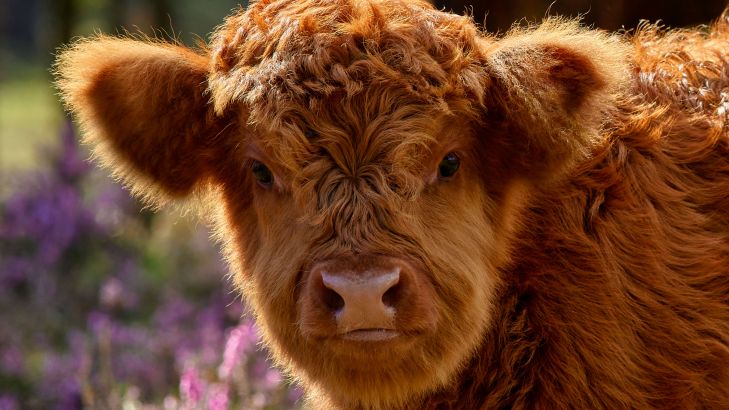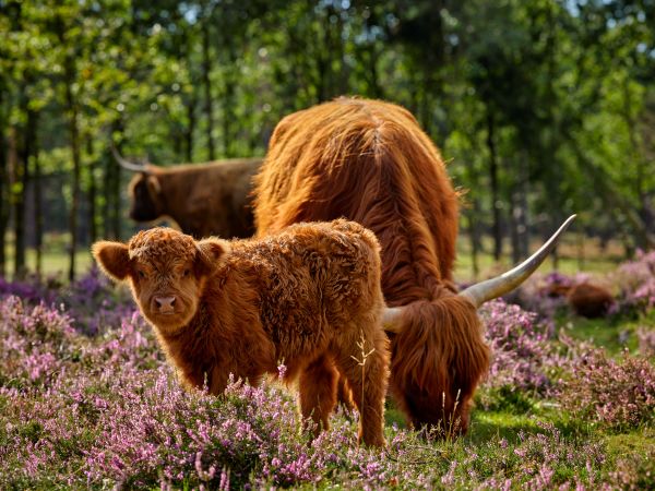Familie af skotske højlandere med foran en ung kalv, som er blevet fotograferet knivskarpt.