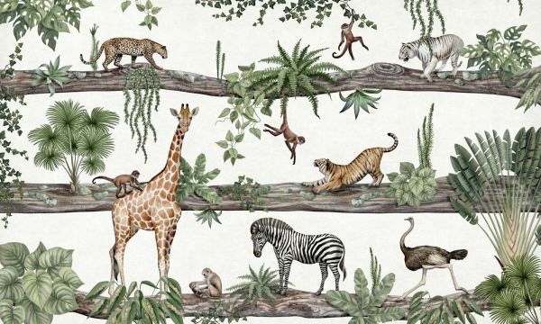 En livlig jungle fuld af eksotiske dyr som tigre, aber, giraffer og zebraer, omgivet af tropiske blade og lianer. De naturlige grønne nuancer og varme brune- og okertoner skaber en legende og eventyrlig følelse, med en rig kontrast på en lys baggrund.