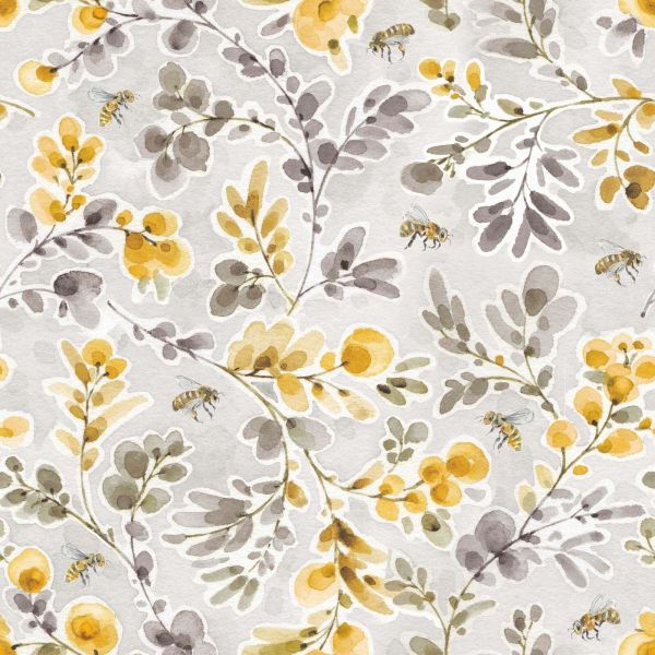 Et blødt akvarelmønster med dansende bier mellem gule blomstergrene og grågrønne blade. Farverne er harmoniske og beroligende, med varme okkergule nuancer og subtile gråtoner.