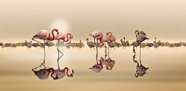 En flamingofamilie i midten af en sø. Du kan se flamingoernes spejlbillede i vandet.