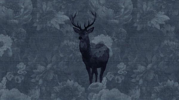 Et hjort vises som en subtil, men fremtrædende vogter på et lærred af dybblåt tekstil. Omringet af konturer af blomster og blade skaber dette design en fascinerende illusion af dybde og tekstur, hvilket får hjorten til næsten at træde ud af stoffet.