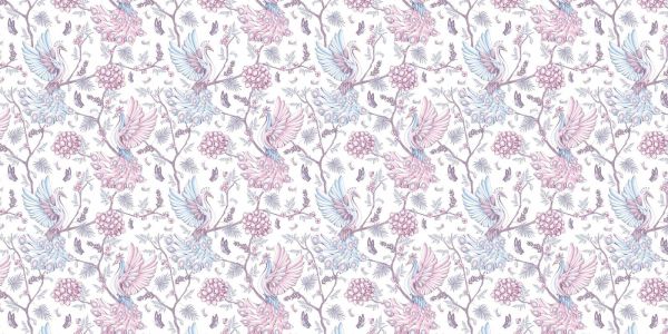 Bløde pastelfarver af rosa og blåt bringer en luftig forårsessens til live i dette design, med graciøst spredte påfugle, der danser mellem blomstrende grene.