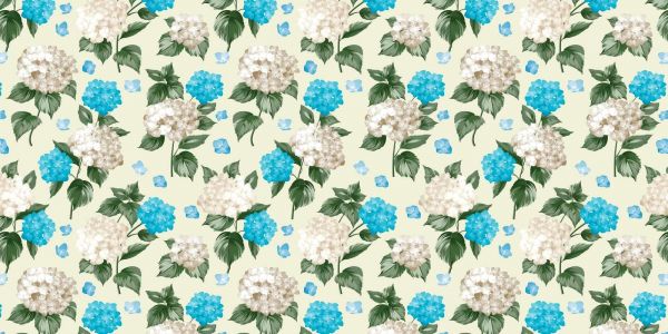 Kendetegnende for dette design er den livlige gengivelse af hortensiaer i nuancer af himmelblåt og elfenbenshvidt, suppleret med sommerfugle i matchende farver på en blød, cremefarvet baggrund. Billedet fremkalder en følelse af en blid forårsbrise og en spirende natur.