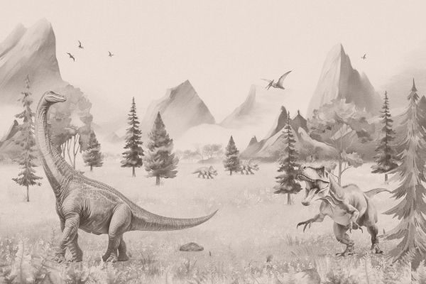 En tidløs scene, hvor majestætiske dinosaurer dominerer landskabet. Gråskala understreger den rolige atmosfære i forhistorisk tid med omhyggeligt detaljeret flora og en bjergrig horisont, der skaber en følelse af rummelighed.